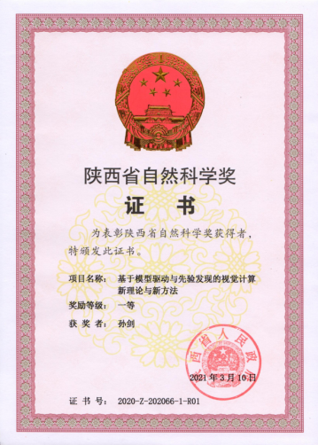 必赢唯一官方网站孙剑、李慧斌、杨燕完成的“基于模型驱动与先验发现的视觉计算新理论与新方法”项目荣获2020年度陕西省自然科学奖一等奖。