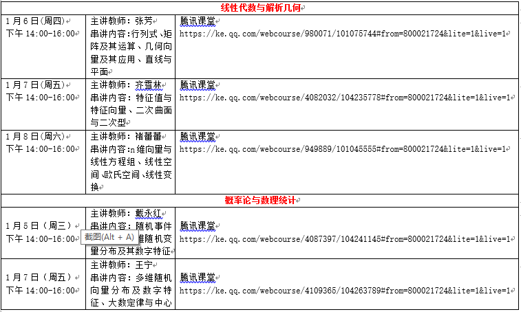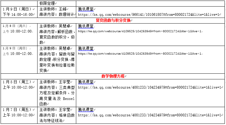 1月5日起,学院面向全校学生开设线上串讲,包括“高等数学I、II”“线性代数与解析几何”“概率论与数理统计”“复变函数和积分变换”“数学物理方程”等多门课程,总结各课程教学内容,系统梳理课程学习应该掌握的知识点和计算方法。