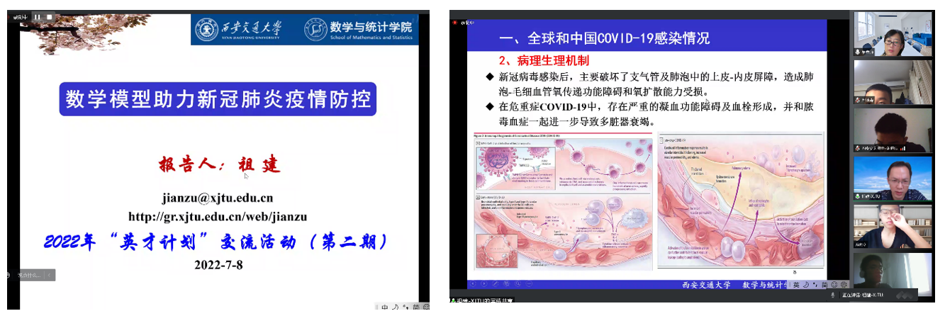 祖建教授以“数学模型助力新冠肺炎疫情防控”为题,结合多年来从事生物数学和传染病动力学研究的亲身经历,深入浅出地为同学们介绍了数学在传染病防治中的实际应用。祖老师首先介绍了西安交通大学生物数学研究团队的概况,向同学们展示了生物数学广阔的研究前景和重要应用价值。然后,祖老师从最简单的“仓室模型”谈起,向同学们逐步展示了如何构建合理的传染病动力学模型并利用模型对感染人数做出预判。进一步,祖老师通过模型说明了采取隔离防治是十分必要的。通过对必赢唯一官方网站在2003针对SARS病毒和近三年来针对新冠疫情的预测的介绍,同学们对传染病动力学有了初步了解,也从数学的角度理解了当前国家所采取的防疫手段。