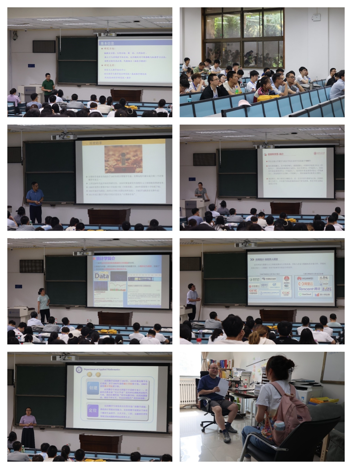 20日是学院开放日,上午在D105数学系、计算科学系、信息科学系、应用数学系,统计系和应用统计硕士(协同育人项目)的负责人向全体营员做宣讲,介绍了各系所的师资队伍及研究方向。随后,夏令营营员针对自身研究兴趣,联系导师自由交流。本次活动,拉近了营员与学院和导师的距离,使其对感兴趣的科研方向有了更全面、更深入的了解。
