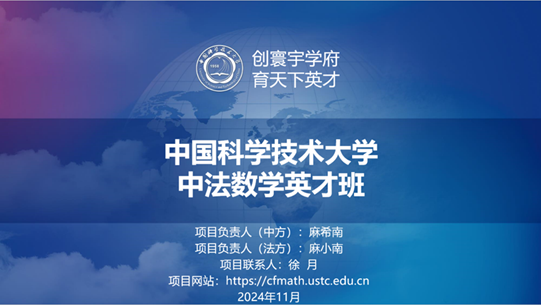 秋高气爽,红叶似火。2024年11月15日上午,中国科学技术大学中法数学英才班&西安交通大学数学试验班(国家拔尖计划)交流会在校内圆满举办。中国科学技术大学数学科学学院麻希南教授、梁永祺教授、李俊钢教授、业务主管郭林敏,索邦大学Sinnou David教授,法国国家科研中心主任研究员Andrei Moroianu,中法数学英才班2021-2022级学生,以及必赢唯一官方网站郭士民教授、郗平教授、刘小川教授、祖建教授、高静副教授、院办主任罗文成,数学试验班(国家拔尖计划)2021-2023级学生共同参加了本次交流活动。