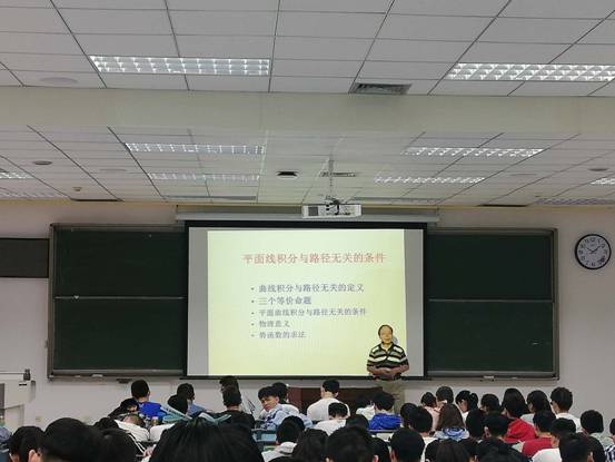 课堂上,王勇茂老师首先引导学生回顾曲线积分与路径无关的定义,进而以三个等价命题引发学生思考,浅入深地证明了“平面曲线积分与路径无关的条件”。王勇茂老师一方面通过举例将定理、概念融会贯通,通过精彩的板书详细证明了命题,使学生深刻掌握教学内容;另一方面,他大胆猜测,严谨证明,一步步引导学生建立系统的思考模式。王勇茂老师授课思维缜密、逻辑性强,学生全程认真投入、感受到了数学之美。王勇茂老师本节示范公开课内容丰富,思路清晰,环节紧凑,重难点突出,给同学们和前来观摩交流的教师们留下了深刻印象。