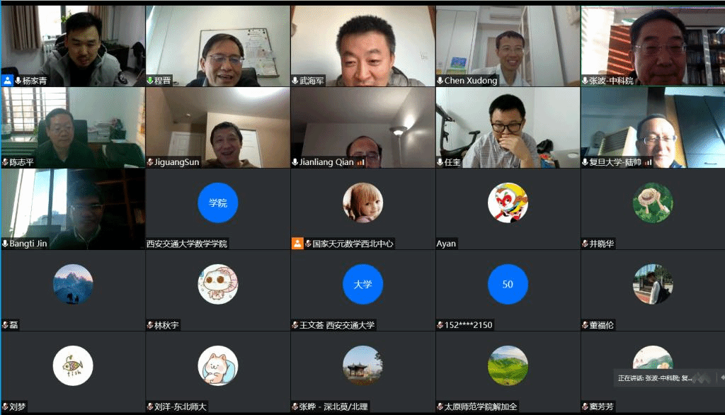 1219-22日,国家天元数学西北中心在线举办“模型数据混合驱动的石油勘探反演方法专题研讨班”。研讨班邀请北京大学张平文院士担任活动首席科学家,中科院数学与系统科学研究院张波研究员、西安交大杨家青副教授为活动召集人。活动邀请了十余位国内外知名专家分享他们关于正演及反演的数学理论与快速算法等方面的最新研究成果,来自31所高校及科研院所的百余位学者在线参加。