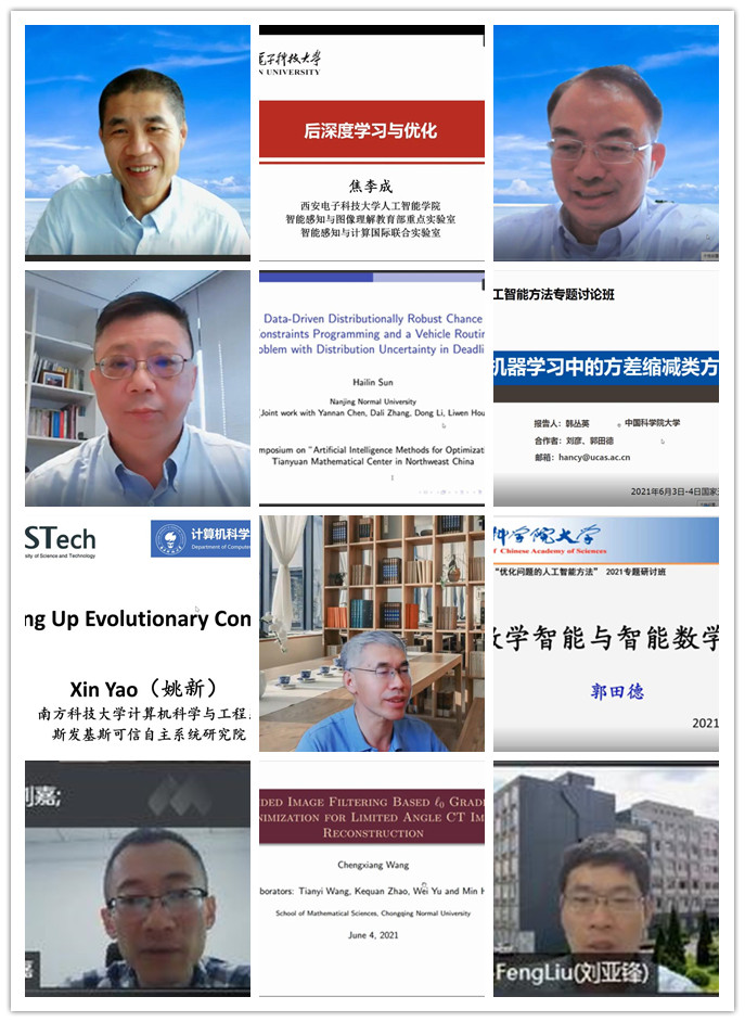 随后,研讨班进入报告环节。12位从事人工智能和最优化交叉领域的资深学者及一线专家作了精彩的学术报告,内容涵盖了后深度学习与优化、整数规划若干理论和应用进展、机器学习中的随机方差缩减类算法研究、数学智能与智能数学、加速演化计算等前沿研究方向,为与会学者带来一场学术盛宴。与会学者纷纷就自己感兴趣的内容通过线上语音或留言的方式提问,与专家们充分交流、热烈讨论。