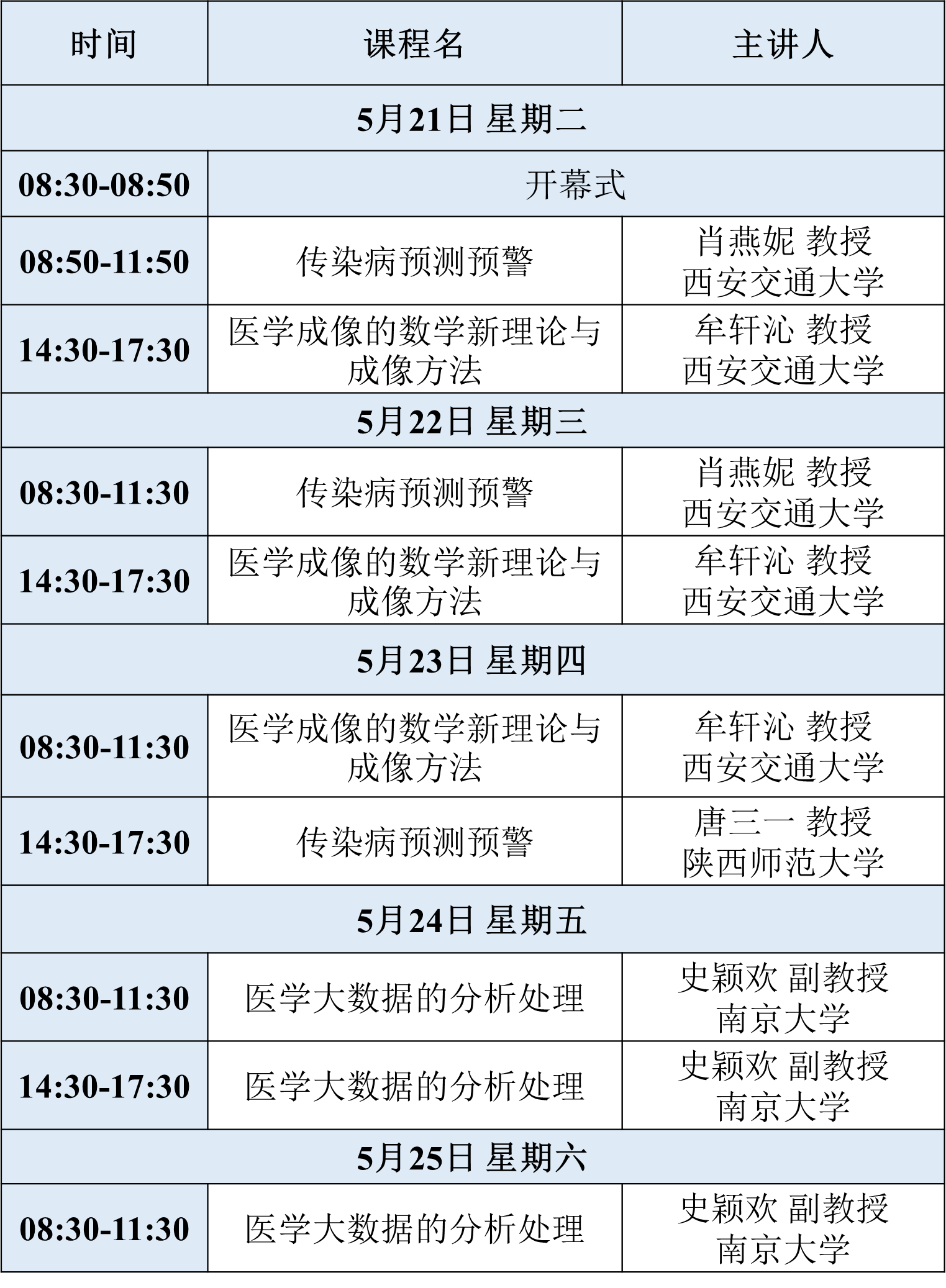 国家天元数学西北中心定于2024年5月21-25日在西安交通大学兴庆校区线下举办“医疗健康大数据分析处理的典型应用方法讲习班”。讲习班共开设“医学大数据的分析处理”“医学成像的数学新理论与成像方法”和“传染病预测预警”三门课程,将详细介绍医学大数据分析处理的理论方法及其典型应用,包括医学成像反问题求解、医学影像计算、多模态医疗信息融合等,讲授其中最新的模型构建、理论分析和数据分析方法;介绍传染病预测与防控研究中的核心难点问题;介绍医学大数据智能处理与分析方法在重大/常见疾病智慧诊疗、脑认知等方面的典型应用。