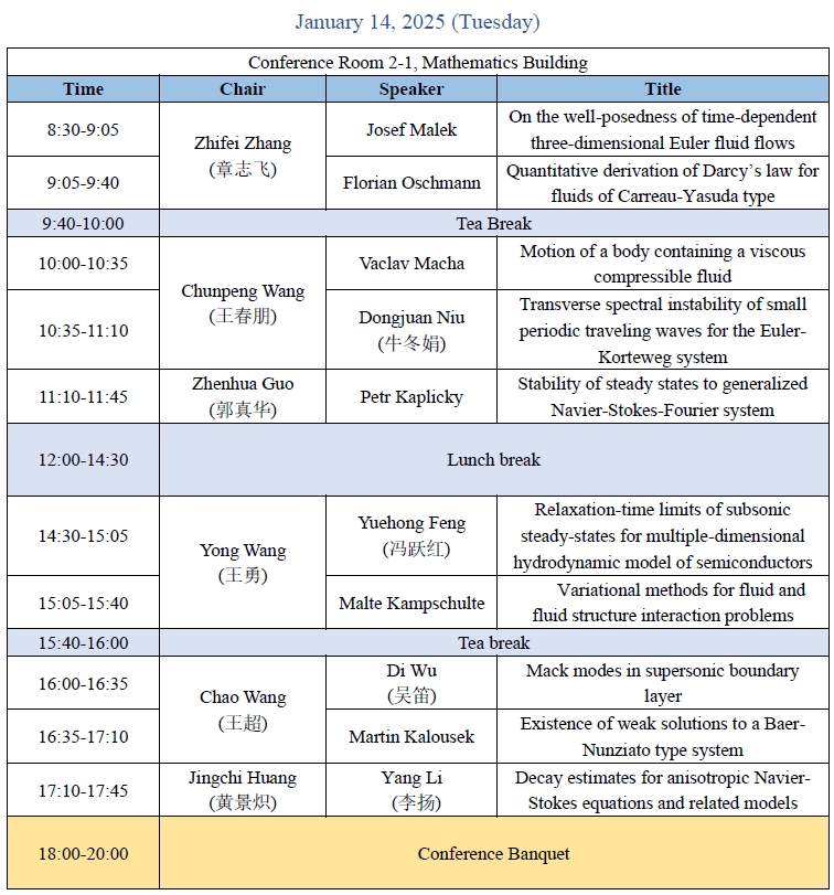 The mathematical study of partial differential equations in fluid mechanics is an important area of research in the field of partial differential equations, with significant theoretical and practical implications. In recent years, this field has advanced rapidly, with numerous breakthroughs in general theory and special solution theory. Czech mathematicians developed their own system for studying fluid mechanics equations and achieved significant research results. At the same time, many Chinese mathematicians have had close exchanges and long-term collaborations with Czech mathematicians working on mathematical fluid dynamics. The conference will serve as a forum for reporting new research breakthroughs, exchanging research ideas, and planning new collaborative research during and after the conference.