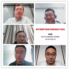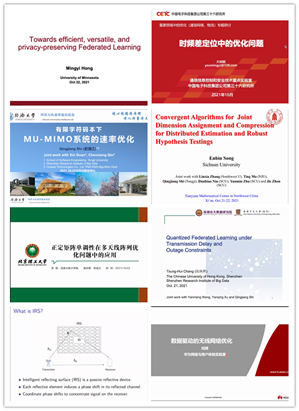 随后,会议进入报告研讨环节。蒋培刚高级技术专家针对未来5.5/6G系统的特性和性能演进需求,畅谈了如何借助数学理论和数学工具设计高性能低复杂度的计算方法;张瑞教授介绍了通信和最优化技术在无人机领域中的运用;华为技术有限公司闫琦专家介绍了团队在数据驱动的无线网络环境建模以及大规模网络优化等方向的研究方法以及试验结果。中电三十六所尤明懿研究员分享了基于时频差参数的辐射源定位优化算法;浙江大学钟财军教授重点介绍了如何利用深度学习解决传统多天线系统设计与优化所面临的高复杂度问题;同济大学史清江教授与大家探讨了有限字符输入下MU-MIMO系统速率优化问题的两种解决方案;西安电子科技大学王勇超教授、美国明尼苏达双城分校洪明毅教授、四川大学宋恩彬教授、深圳市大数据研究院张莲民副研究员、香港中文大学(深圳)张纵辉副教授、沈闓明助理教授、浙江大学刘安研究员、北京理工大学邢成文教授等分别从数据驱动的无线网络优化、基于深度学习的多天线系统设计与优化、时频差定位中的优化问题、Federated Learning算法等不同的角度,与大家深入探讨优化方法在不同重要场景中的应用及发展。他们慷慨分享自己的科研成果,并通过线上问答同与会学者交流研究经验。会议学术氛围浓厚、讨论积极热烈。