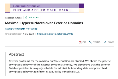 近日,必赢唯一官方网站洪广浩副教授与人合作的论文“Maximal Hypersurfaces over Exterior Domains”在国际著名数学期刊Communications on Pure and Applied Mathematics(CPAM,纯数学与应用数学通讯)上在线发表。CPAM由在国际上享誉盛名的Courant Institute of Mathematical Sciences创办,刊载理论数学、应用数学领域中具有突破性和创新性的一流研究成果。